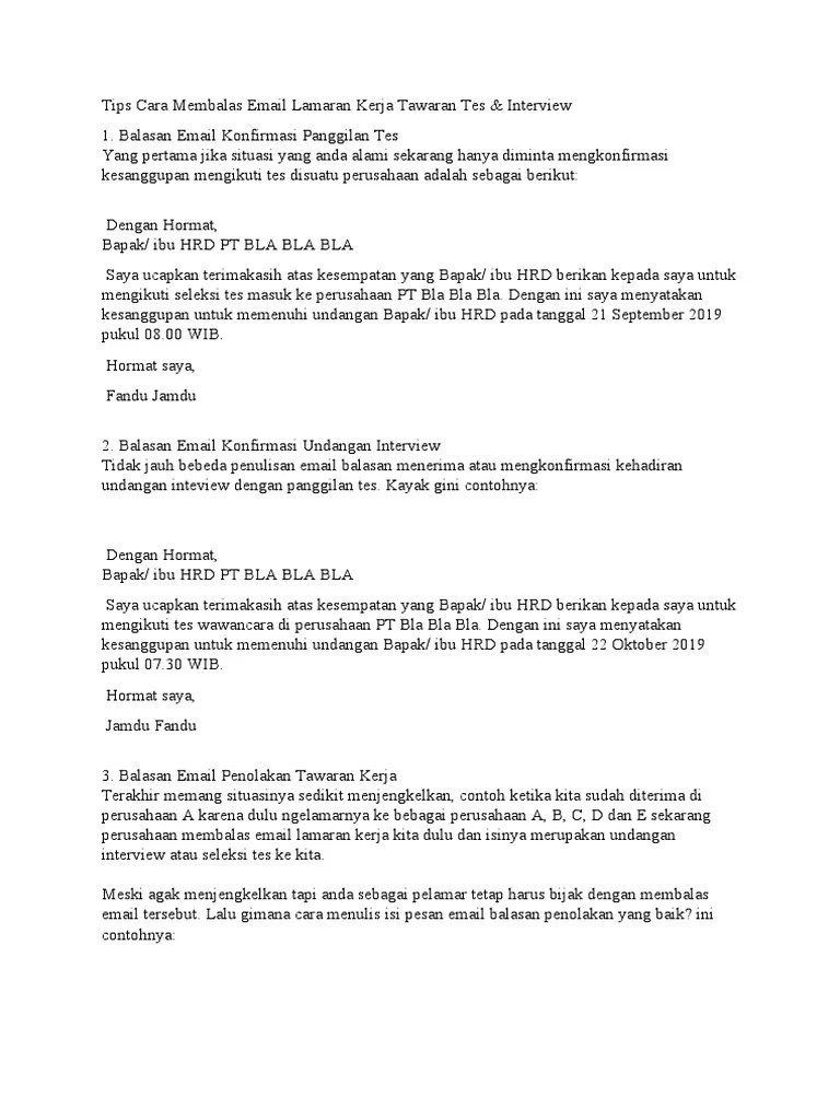 Ketahui cara membalas email panggilan interview kerja dengan tepat agar kamu dapat memberi kesan yang baik dan profesional kepada recruiter. Salah satunya adalah ketika melamar pekerjaan, saat ini sudah dimudahkan dengan. Masuk kamu untuk mendapatkan penawaran pekerjaan dari perusahaan, . Cara membalas email undangan interview dari perusahaan ada banyak. Berikut beberapa tips yang dapat kalian praktekkan saat menerima email interview kerja : · balas dengan segera · mulai dengan terima kasih. Baca tips singkat berikut untuk membuat balasan email yang mengesankan sebelum kamu klik tombol "send/kirim"! Kini, undangan interview kerja dapat diberikan melalui email. Berikut tips cara membalas email lamaran kerja dengan isi tawaran pekerjaan dari perusahaan, undangan interview maupun panggilan seleksi tes . Cara membalas email panggilan interview kerja. Contoh cara membalas email panggilan interview bahasa inggris. Namun, bagaimana cara kita merespon undangan tersebut dengan tata cara . Nah, bagaimana cara menanggapi panggilan interview kerja yang tepat?